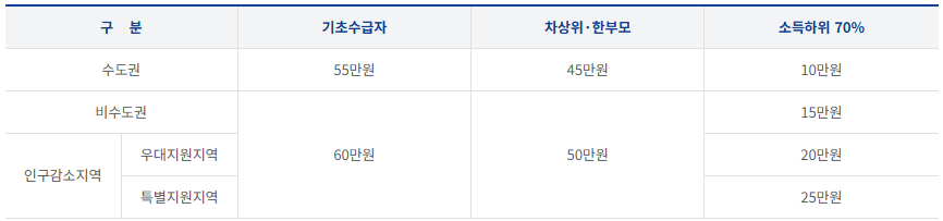 • 일반 70% 대상자: 수도권 10만 원 / 비수도권 15만 원 / 인구감소 우대지역 20만 원 / 특별지역 25만 원